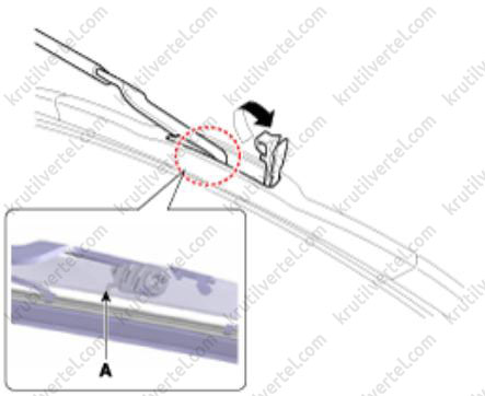 2. При необходимости освободите фиксирующий зажим щетки стеклоочистителя, подняв его вверх, и снимите щетку стеклоочистителя с внутреннего радиуса (А) рычага стеклоочистителя.