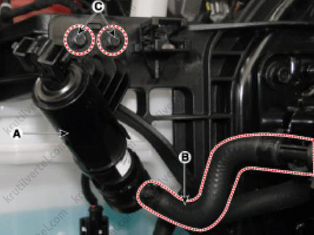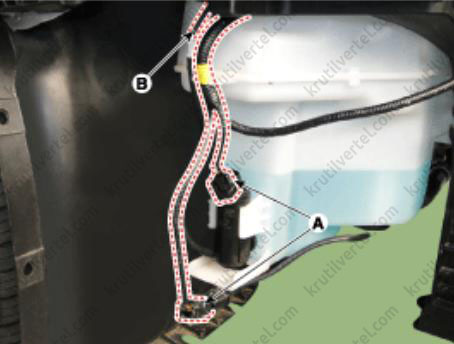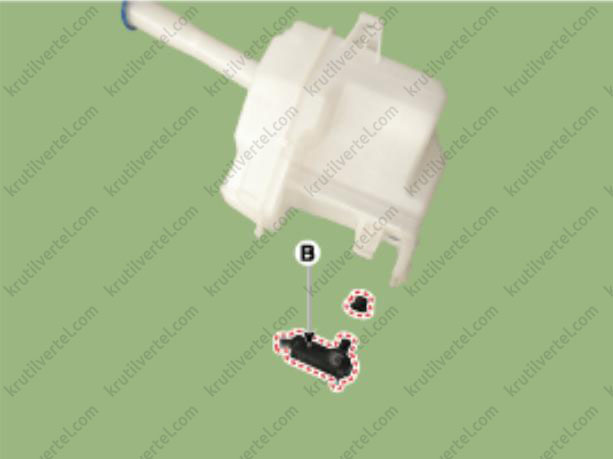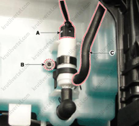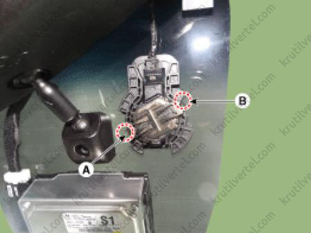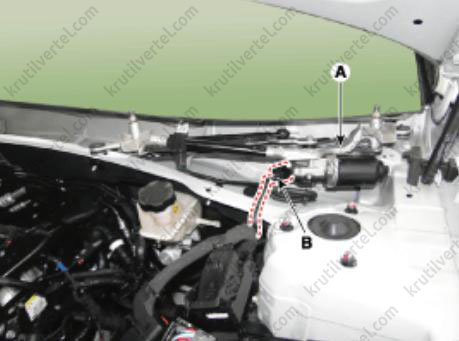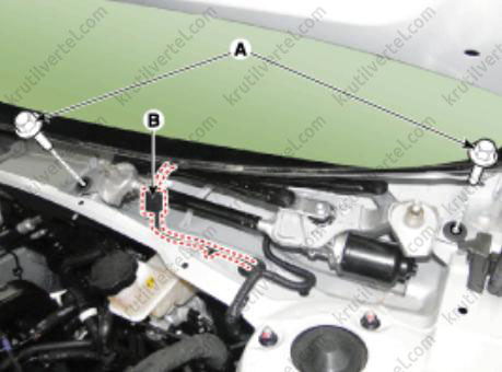 4. Отверните болты крепления (А) узла электродвигателя стеклоочистителя и отсоедините электрический разъем (В) обогревателя ветрового стекла.