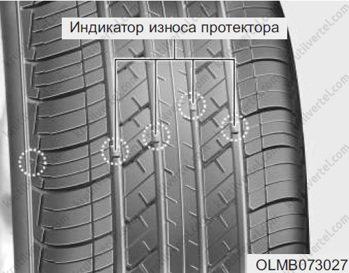 Сцепление шины с дорогой может ухудшиться при езде на изношенных, плохо накачанных шинах или езде по дорогам со скользким покрытием. Когда становится виден индикатор износа, шины необходимо заменить. Для уменьшения вероятности потери управления автомобилем снижайте скорость во время дождя, снега или при движении по обледеневшей дороге.