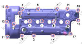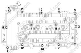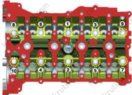- За несколько подходов равномерно ослабьте и выверните десять болтов крепления головки блока цилиндров с помощью торцевого ключа в последовательности, указанной ниже. Снимите десять болтов крепления головки блока цилиндров с тарельчатыми шайбами.