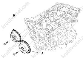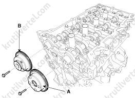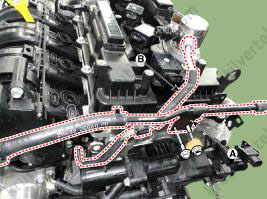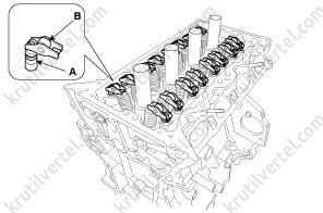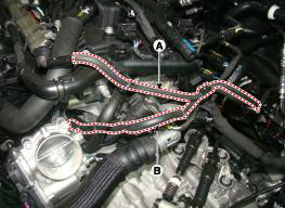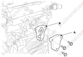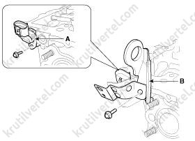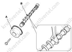 15. Снимите подвесную проушину двигателя (B), затем снимите датчик положения распределительного вала (CMPS) выпускных клапанов (A).