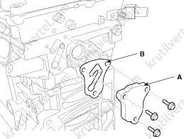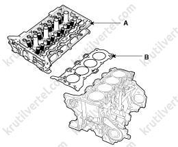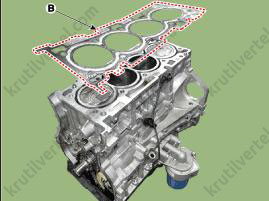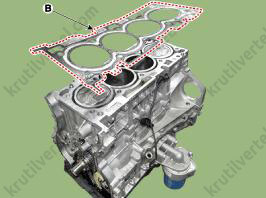 - Нанесите прокладочный герметик (Loctite 5900H или аналогичный) на край прокладки головки блока цилиндров сверху и снизу (положения «B»).