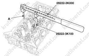 - С помощью специальных инструментов (№ 09222-3K000 и № 09222-3K100) сожмите пружину клапана и установите сухари. После установки клапана, перед высвобождением пружины, проверяйте правильность установки приспособления для сжатия пружин клапанов.