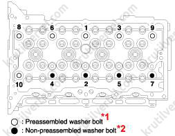 - Обязательно используйте новые болты крепления головки блока цилиндров. Затягиваемые до предела текучести болты головки блока цилиндров являются одноразовыми деталями. При закручивании превышается их предел упругости. Поэтому, если использовать старые болты, они могут сломаться или не обеспечить необходимое сжимающее усилие