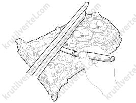Измерьте искривление контактных поверхностей блока цилиндров и коллекторов с помощью проверочной линейки и щупа. Если пологость превышает максимальное значение (см. «Данные по обслуживанию» в конце главы), замените головку блока цилиндров новой.