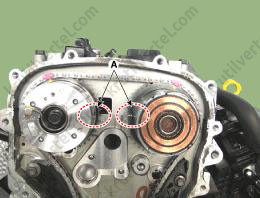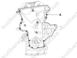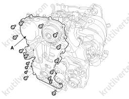 13. Равномерно отверните болты крепления и снимите крышку (A) цепи привода газораспределительного механизма.