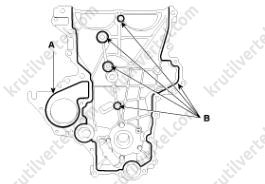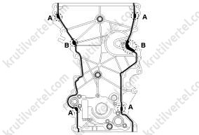 - Нанесите прокладочный герметик THREE BOND 1282B или THREE BOND 1216E на контактные части (А) насоса охлаждающей жидкости и крышки цепи привода газораспределительного механизма, на остальные части (В) нанесите прокладочный герметик THREE BOND 1217H или LOCTITE 5900H. Крышку необходимо установить в течение пяти минут после нанесения герметика. Для предупреждения образования возможного пути утечки масла герметик необходимо наносить непрерывной полосой.