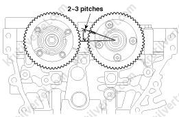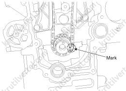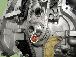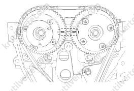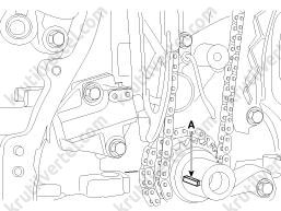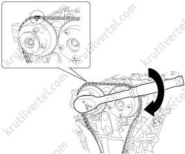 4. Установите цепь привода газораспределительного механизма. Чтобы установить цепь привода газораспределительного механизма без провисания между валами (распределительным и коленчатым), следуйте процедуре ниже: