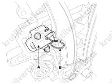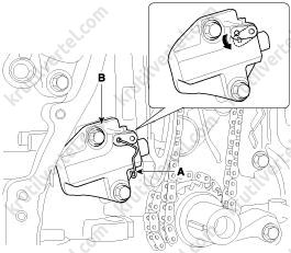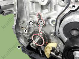 9. Снимите масляную форсунку (А) цепи привода газораспределительного механизма и звездочку (В) цепи распределительного вала.