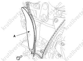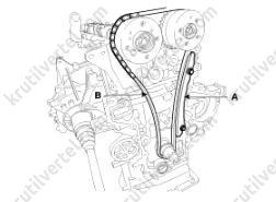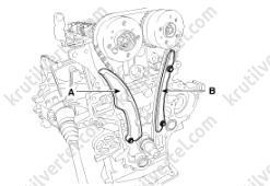 4. Установите направляющую (А) и цепь привода газораспределительного механизма (В).