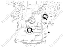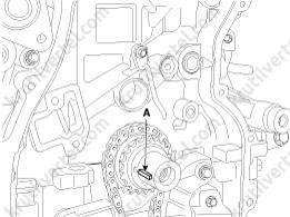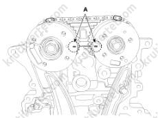 3. Установите коленчатый вал так, чтобы шпонка (А) звездочки коленчатого вала была совмещена со стыковочной поверхностью крышки коренного подшипника. Разместите узел распределительных валов впускных и выпускных клапанов так, чтобы отметки ВМТ на звездочках впускного и выпускного CVVT находились на одном уровне с поверхностью головки блока цилиндров. При этом поршень цилиндра №1 будет находиться в положении ВМТ такта сжатия.