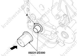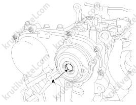 Выполняется аналогично, как и на двигателях 2,0 л T-GDI и 2,4 л (см. ниже), при этом обратите внимание на следующую особенность: запрессуйте сальник (А) с помощью специального инструмента (№ 09231-2E000).