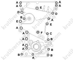 - Момент затяжки: 18,6 - 23,5 Н·м (болты А и В), 19,6 - 23,5 Н·м (болт С), 39,2 - 49,0 Н·м (болты D, E) и 9,8 - 11,8 Н·м (болт F).