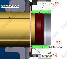- Вставьте специальный инструмент (№ 09243-C2000) в вал электродвигателя E-CVVT.