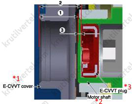 - Рассчитайте глубину запрессовки (3) = (2) - (1) заглушки электродвигателя. Если она не соответствует 1,9 – 2,1 мм, выполните повторную регулировку после замены заглушки E-CVVT.