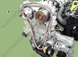 Звездочка коленчатого вала (А) → направляющая цепи привода газораспределительного механизма (В) → звездочка впускного CVVT (С) → звездочка выпускного CVVT (D).