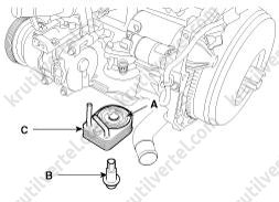 1. Нанесите тонкий слой моторного масла на резиновые уплотнения (А) маслоохладителя, затем установите маслоохладитель (С) и затяните болт (В). Момент затяжки: 50,0 – 55,8 Н·м.