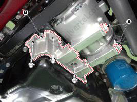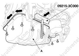 - Установите лезвие специального инструмента (09215-3C000) между нижним картером и масляным поддоном. Удалите нанесенный герметик и снимите масляный поддон.