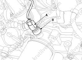 3. Отсоедините электрический разъем (А) и затем снимите датчик давления масла (В).