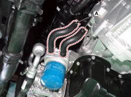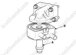 1. Нанесите тонкий слой моторного масла на резиновые уплотнения (А) маслоохладителя, затем установите маслоохладитель и затяните болт крепления (В). Момент затяжки: 44,1 - 53,9 Н·м.