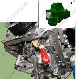 4. Установите стопорный штифт (A) в отверстие натяжителя, предварительно сжав поршень натяжителя цепи уравновешивающего вала.