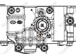 Метки синхронизации звездочки цепи уравновешивающего вала и звездочки коленчатого вала должны совпадать с метками синхронизации (цветное звено) цепи уравновешивающего вала.