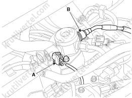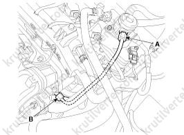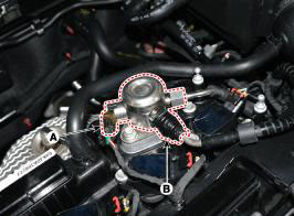 3. Отсоедините разъем (А) клапана регулятора давления топлива и быстросъемный разъем (В) подающего топливопровода.