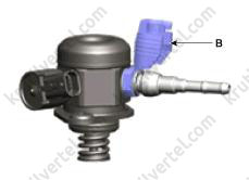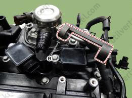 5. Отсоедините электрический разъем (В) датчика давления в рампе.