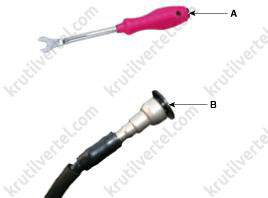 При разъединении быстросъемного разъема с помощью инструмента (А) следует соблюдать осторожность, чтобы не повредить пластиковый хомут (B). При повреждении хомута может возникнуть утечка из топливопровода вследствие слабого соединения.