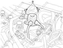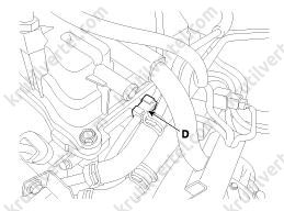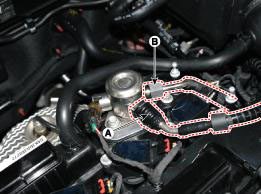 - Отверните болт крепления (D) кронштейна топливопровода высокого давления и затем снимите топливопровод.