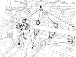 7. Отверните болты крепления (D) и снимите топливную рампу в сборе с форсунками.