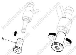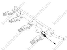 4. Снимите фиксатор (А) и отсоедините форсунку от топливной рампы.