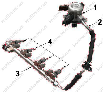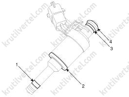- При затягивании болтов крепления топливной рампы сначала полностью вкрутите их вручную, затем в несколько приемов затяните в надлежащей последовательности (2) → (3) → (1) → (4) до указанного момента.