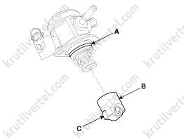 - Нанесите моторное масло на уплотнительное кольцо (А) насоса, роликовый толкатель (В) и выступ (С). Также нанесите моторное масло в канавку, где она соединяется с выступом (С).