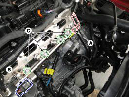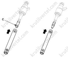 6. Отверните болты крепления (C) и снимите топливную рампу в сборе с форсунками.