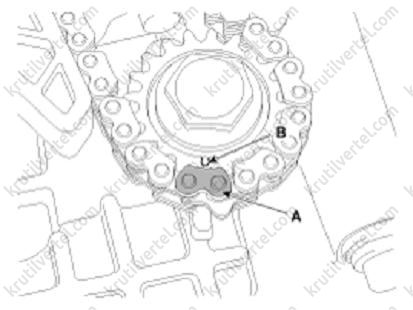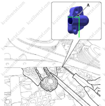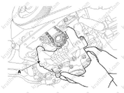 5. Отвернуть болты крепления и снять масляный поддон двигателя (А). Для этого вставить специальный резак (09215-3C000) между рамой лестничного типа и масляным поддоном и разрезать герметик.