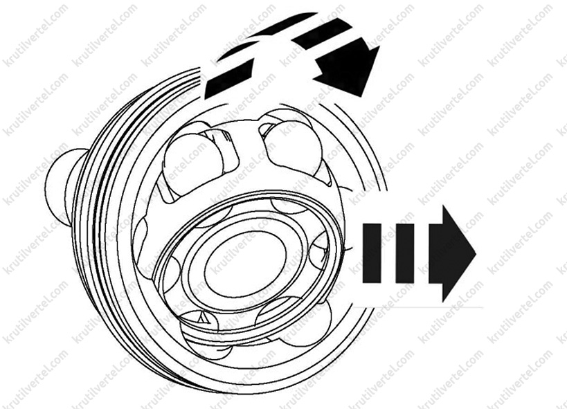 - Не тягнути за вал і кінець обойми зовнішнього підшипника під час складання, щоб уникнути висування трипідного шарніра з обойми внутрішнього підшипника. В іншому випадку внутрішня частина пильовика буде деформована при встановленні, що призведе до витоку оливи та скорочення терміну служби вузла. Перевірка після складання: при появі явного металевого звуку між приводним валом та контактною поверхнею коробки передач, потягніть обойму внутрішнього підшипника назовні за втулку. Якщо її неможливо витягнути, це означає, що вона встановлена на місце.