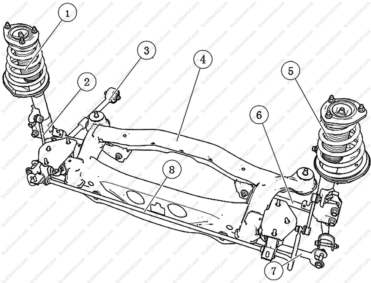 - Ексцентриковий болт разом із шайбою регулювання сходження задніх коліс