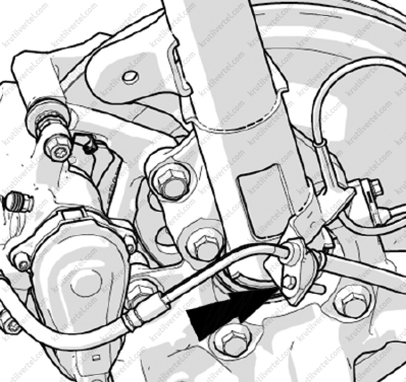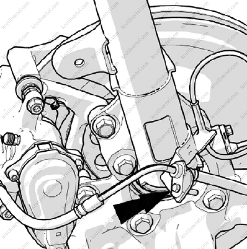 3. Викрутити болт кріплення гальмівної трубки до амортизаторної стійки задньої підвіски, показаний на малюнку нижче. Момент затягування при встановленні: 23 – 25 Н∙м.