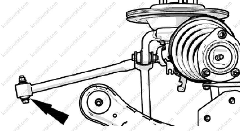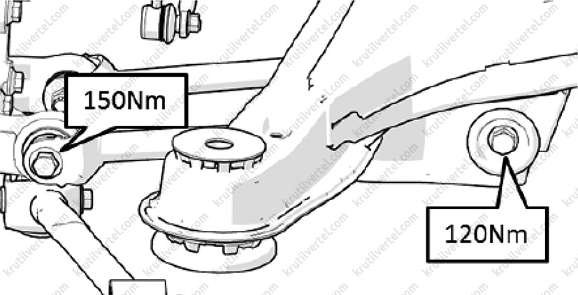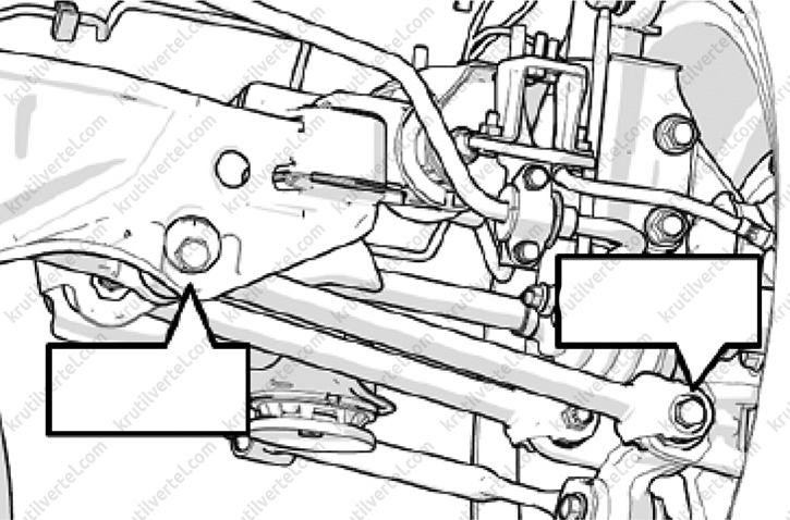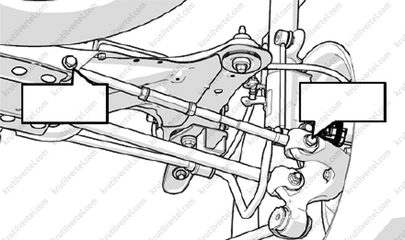 7. Викрутити болти кріплення тяги регулювання сходження коліс до цапфи та підрамника задньої підвіски, як показано на зображенні нижче. Момент затягування при встановленні: 150 – 160 Н∙м (до цапфі), 120 – 130 Н∙м (до підрамника).