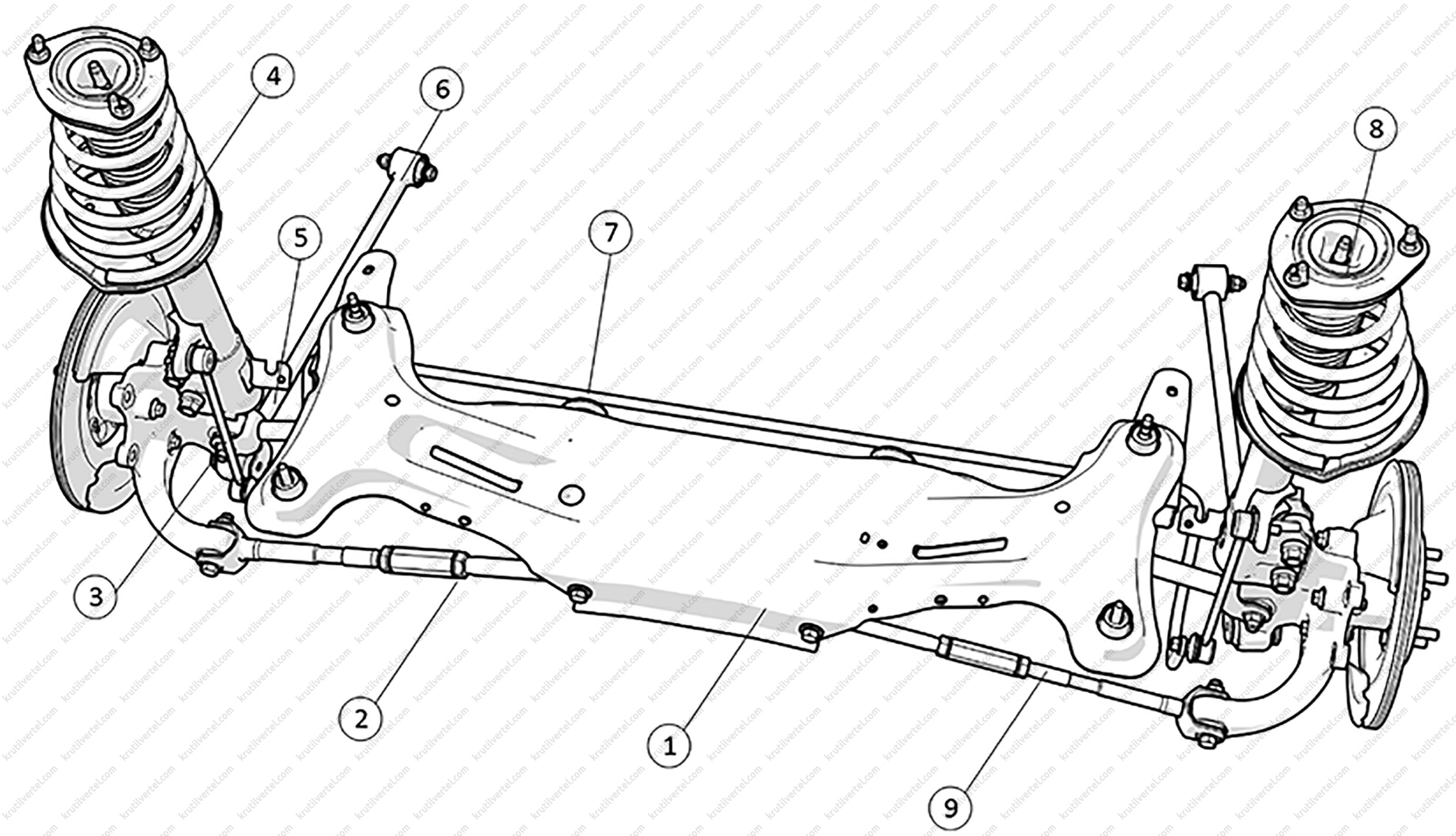 8. Викрутити болти кріплення та зняти задній поперечний важіль підвіски з підрамника та цапфи колеса. Момент затягування при встановленні: 150 – 160 Н∙м (до цапфі), 120 – 130 Н∙м (до підрамника).