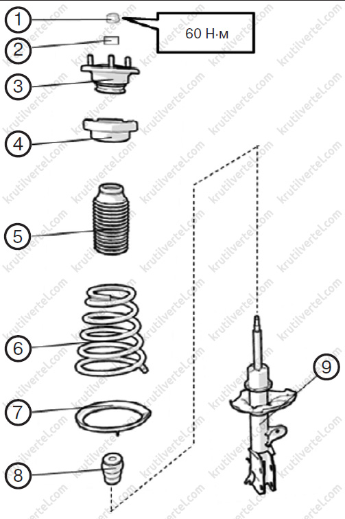 2. На кронштейн амортизатора передньої стійки встановити нижню віброізоляційну опору пружини, потім встановити демпферний блок на шток амортизатора, встановити пильовик амортизатора, після чого пружину встановити на неї встановити верхню віброізоляційну опору. Встановити верхню опору пружини та опору амортизаторної стійки у зборі, як показано на малюнку нижче.