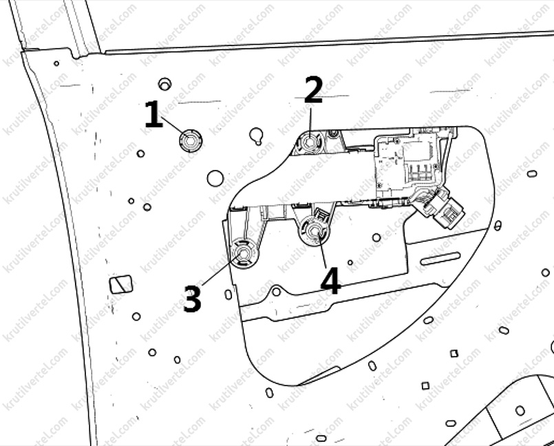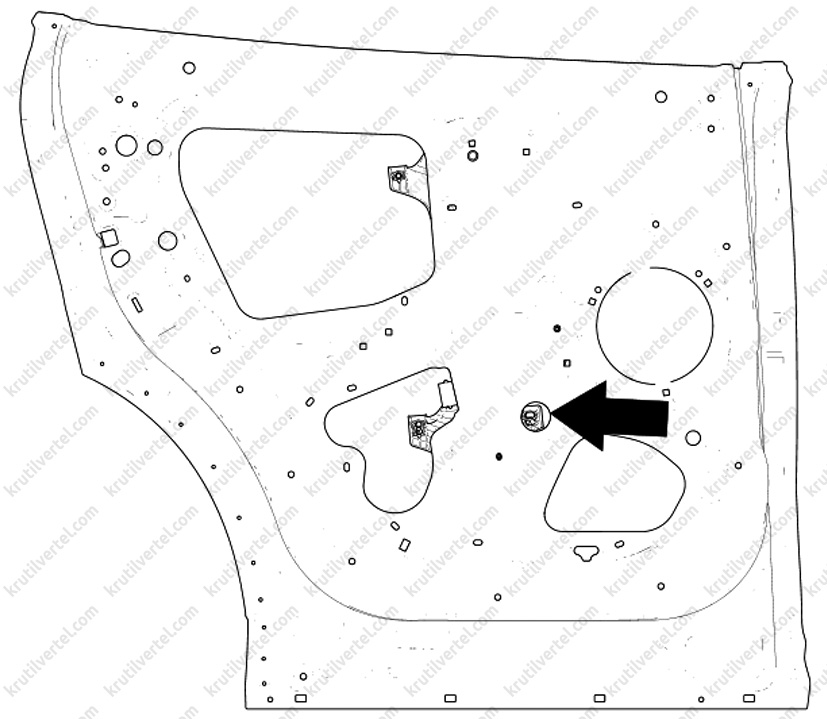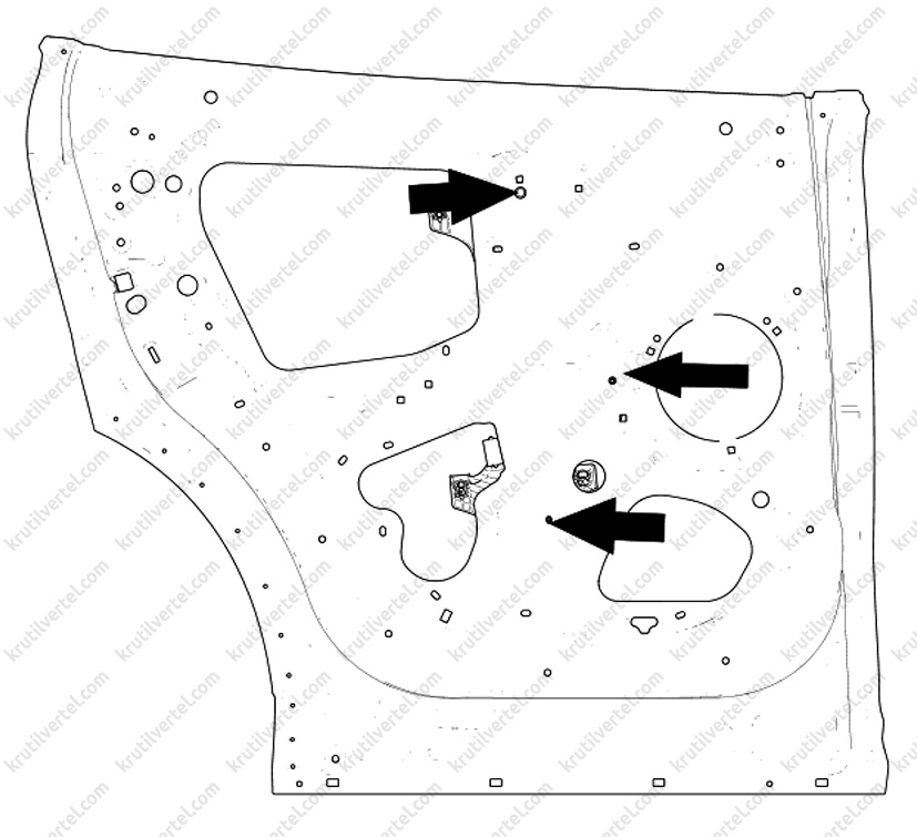 4. Зняти з панелі облицювання передніх дверей кришку динаміка аудіосистеми, після чого викрутити гвинти кріплення, показані на малюнку нижче.