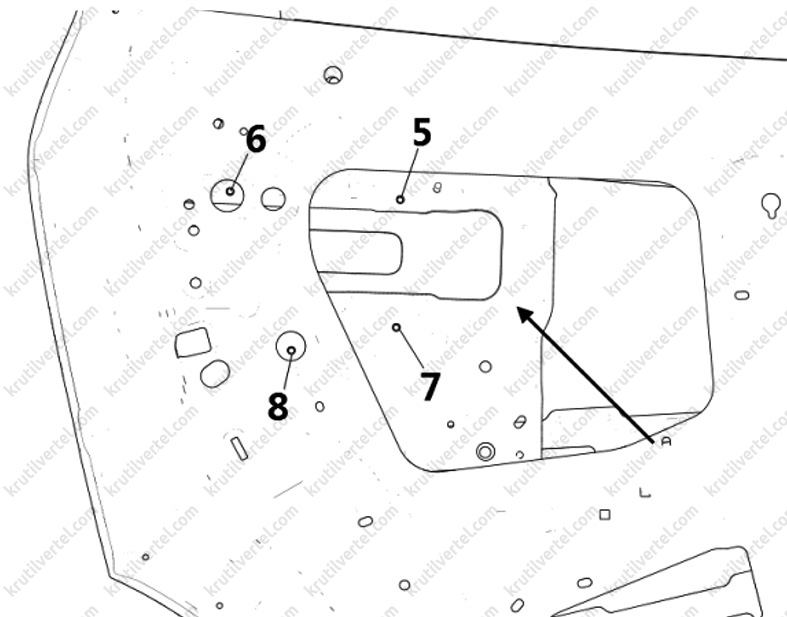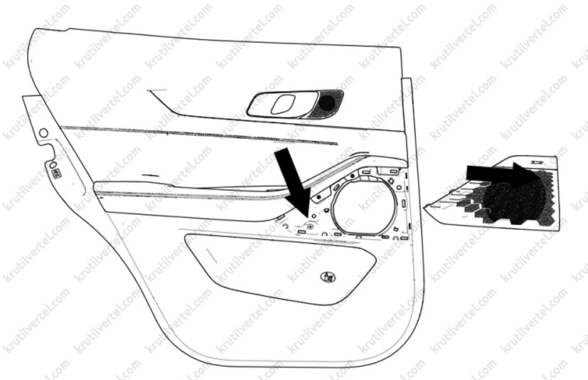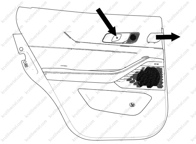4. Зняти з панелі облицювання задніх дверей кришку динаміка аудіосистеми, після чого викрутити гвинти кріплення, показані на малюнку нижче.