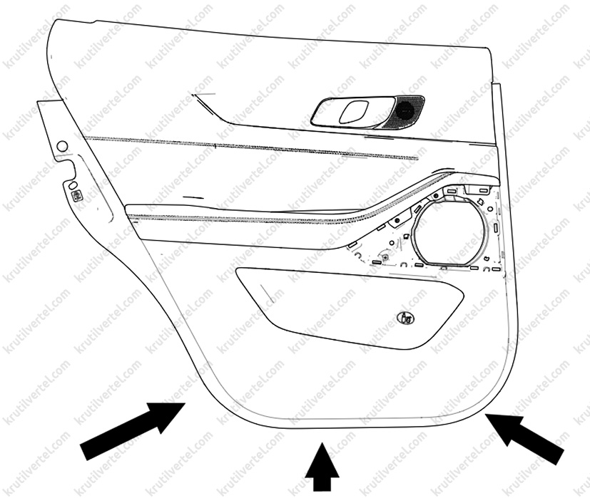 5. Використовуючи спеціальний інструмент, підтягніть, щоб від'єднати фіксатори кріплення облицювання до панелі задніх дверей, як показано на зображенні нижче.
