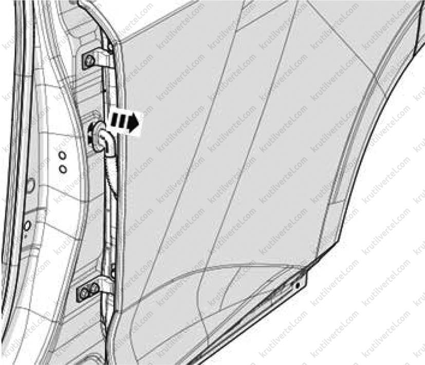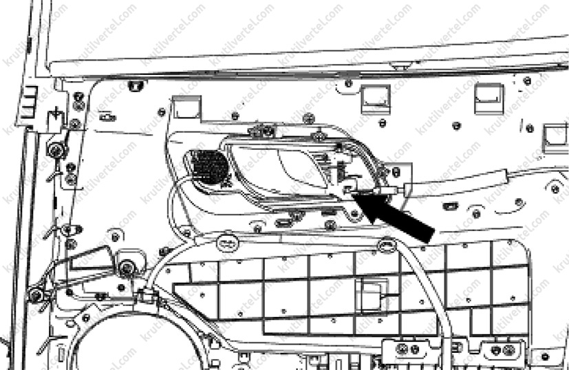 6. Від'єднати від панелі облицювання передніх дверей трос відмикання замка дверей, як показано на зображенні нижче.