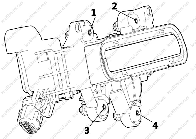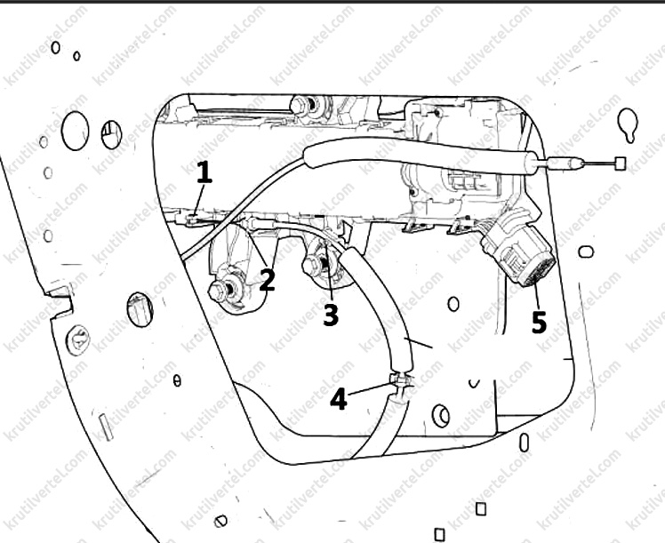 7. Підключити до ручки дверей зовнішній трос (1), після чого послідовно зафіксувати трос у точках (2, 3, 4). На завершення операції, приєднати роз'єм джгута електропроводки (5), як показано на зображенні нижче.
