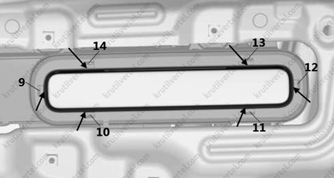 5. Встановити зовнішню ручку через сервісний отвір у дверній панелі, при цьому необхідно переконатися в тому, що монтажні болти (1, 2, 3 і 4) розташовані навпроти монтажних кронштейнів (5, 6, 7 і 8). Одночасно з цим потрібно перевірити і переконатися в тому, що зовнішня ручка відкриття дверей у точках (9, 10, 11, 12, 13 і 14) встановлена врівень з поверхнею дверей, як показано на зображенні нижче. При необхідності відрегулювати розташування ручки щодо дверей.
