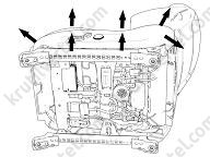 6. Від'єднайте фіксатори кріплення та зніміть бічну кришку переднього сидіння, як показано на зображенні нижче.