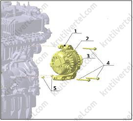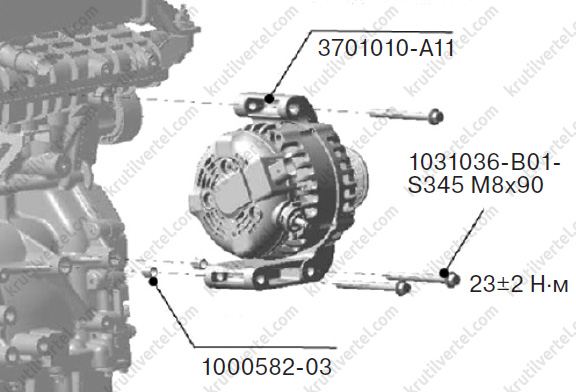 4. Викрутити верхній та нижній болти кріплення генератора у зборі, як показано на зображенні нижче.
